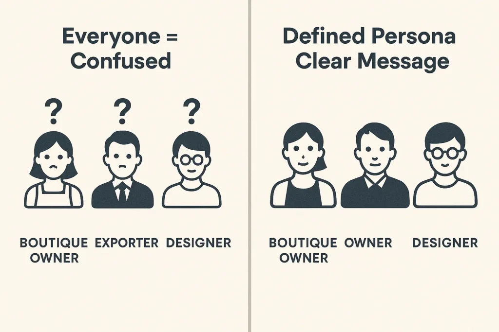 Develop straightforward personas like “Boutique Owners,” “Garment Exporters,” “Fabric Retailers,” or “Interior Designers,” and write down the important things they were thinking about: their goals, challenges, and purchasing behaviors. Then you can shape your textile marketing around their needs instead of using a generic message.